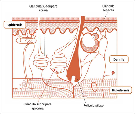 La piel produce unas estructuras denominadas anexos (o anejos) cutáneos, constituidos por el pelo, las uñas y las glándulas sebáceas (segregan sebo) y sudoríparas (segregan sudor).