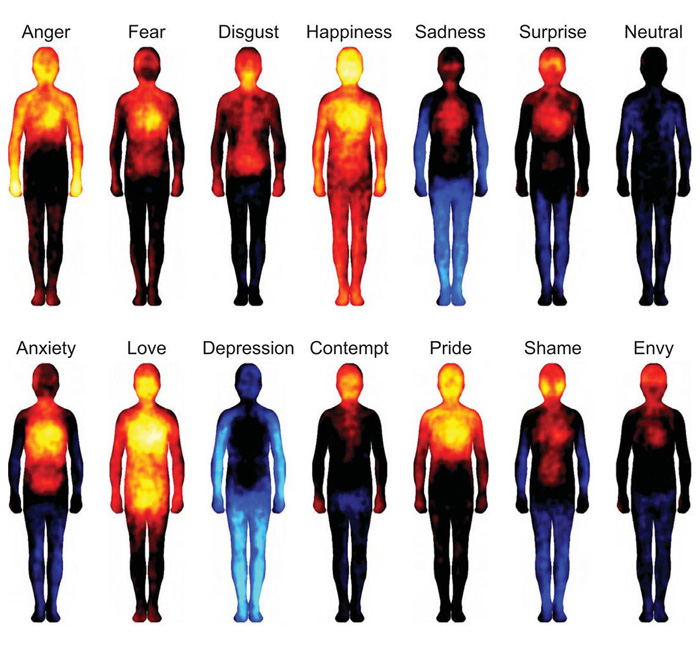 También se puede ver que, en general, todas las emociones básicas activan sensaciones en la parte superior del cuerpo, donde están los órganos vitales, y especialmente en la cabeza.